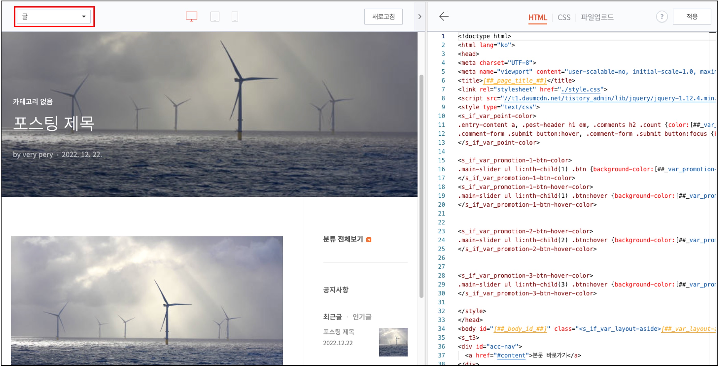그러면 아래와 같은 화면이 나오는데, 왼쪽 상단의 메뉴바에서 '글'로 선택해 줍니다. 이렇게 '글' 상태로 변경해 주면 이후에 html 혹은 CSS를 편집, 적용 한 후 새로고침 버튼을 누르면 편집한 사항이 바로바로 적용되는 모습을 볼 수 있습니다.